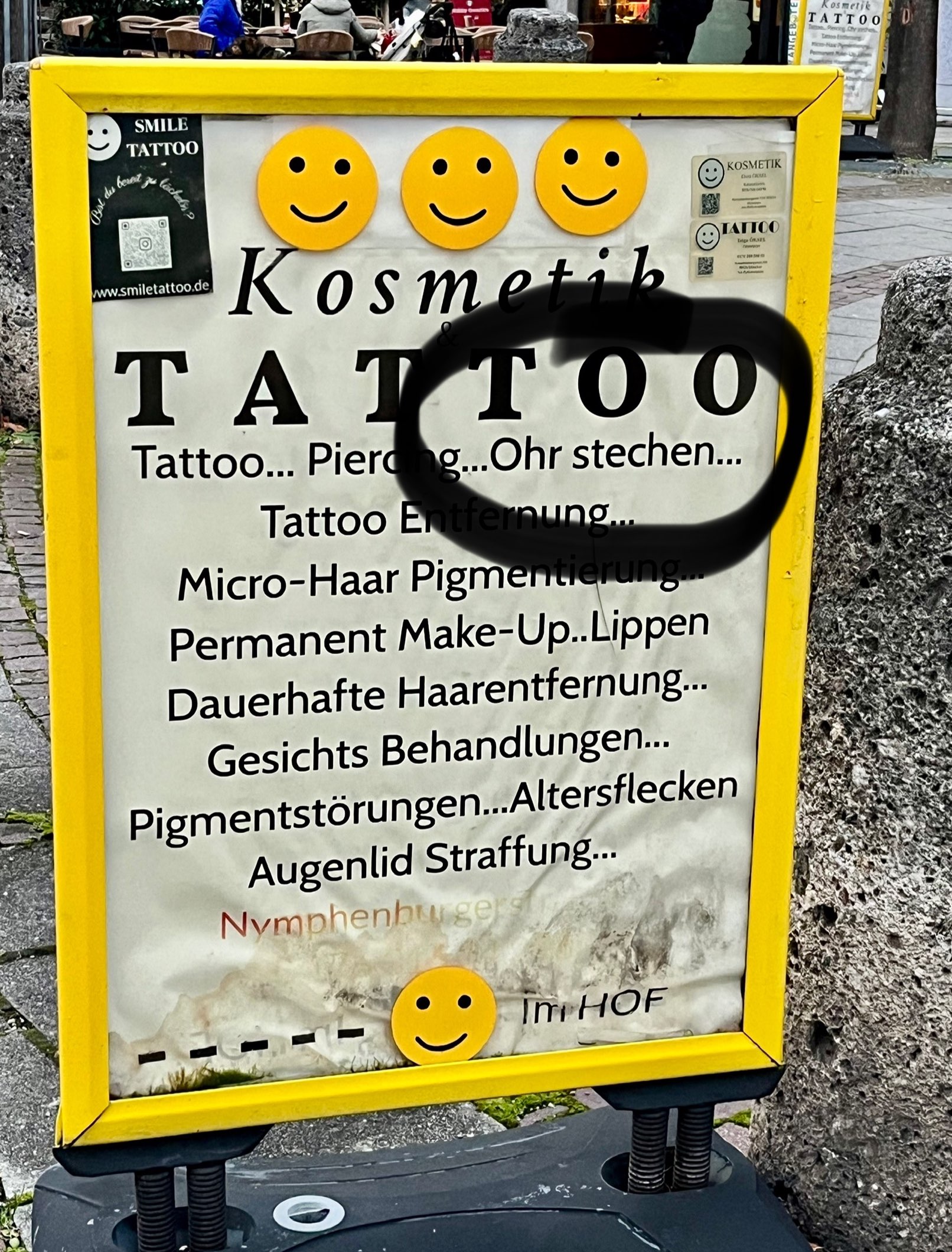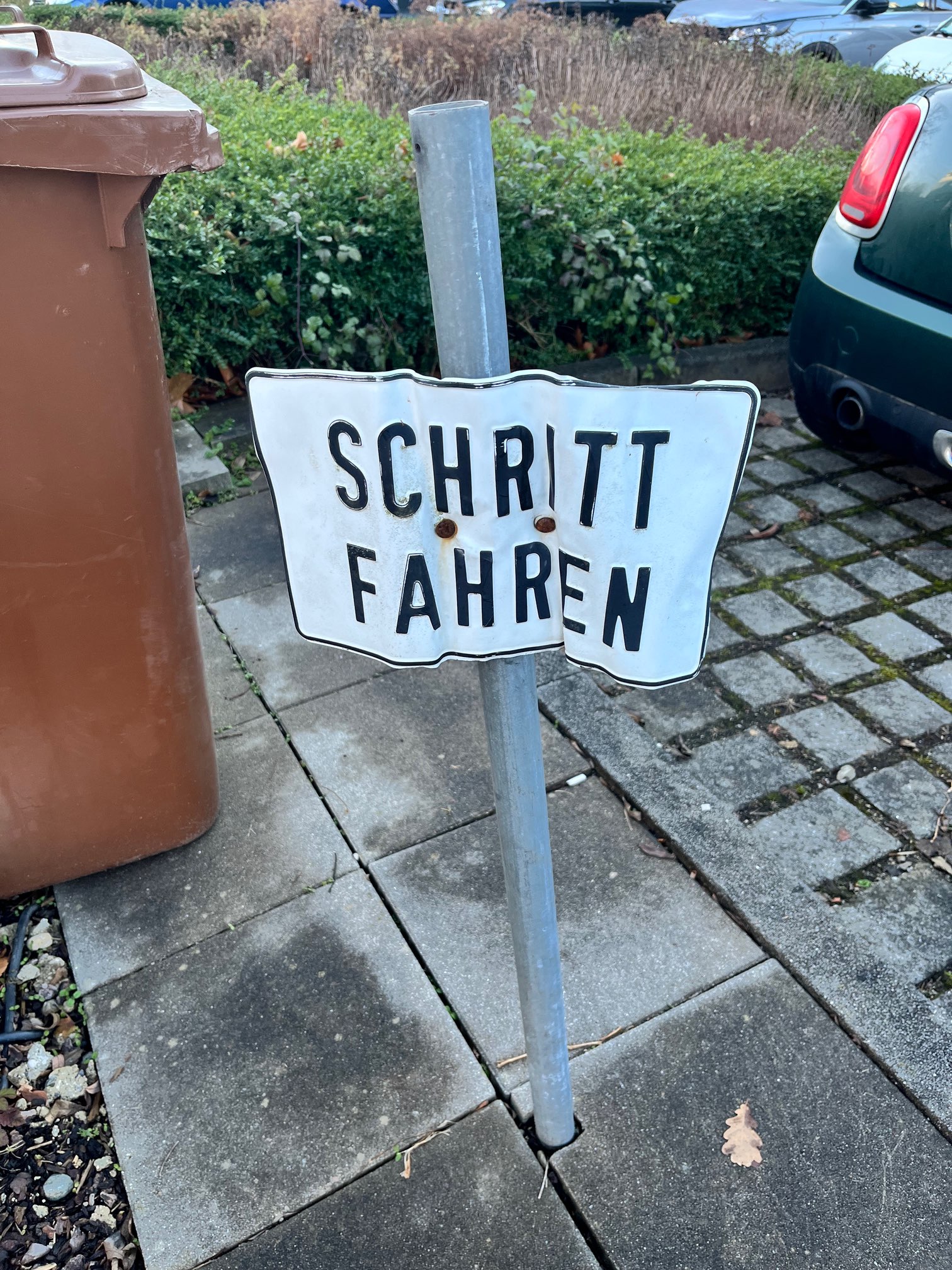 (2. Foto) Gemeint ist wohl, in Schrittgeschwindigkeit zu fahren und es ist korrekt, dass das Wort „Geschwindigkeit“ nicht zu den eingängigsten Worten der deutschen Sprache gehört. Aber es so abzukürzen? Da denke ich mir: Schnell weg hier, sonst fährt der mir noch in meinen Schambereich oder ist gar was Anzüglicheres gemeint? Man weiß ja nie bei solchen Auslegungen unverständlicher Abkürzungen.